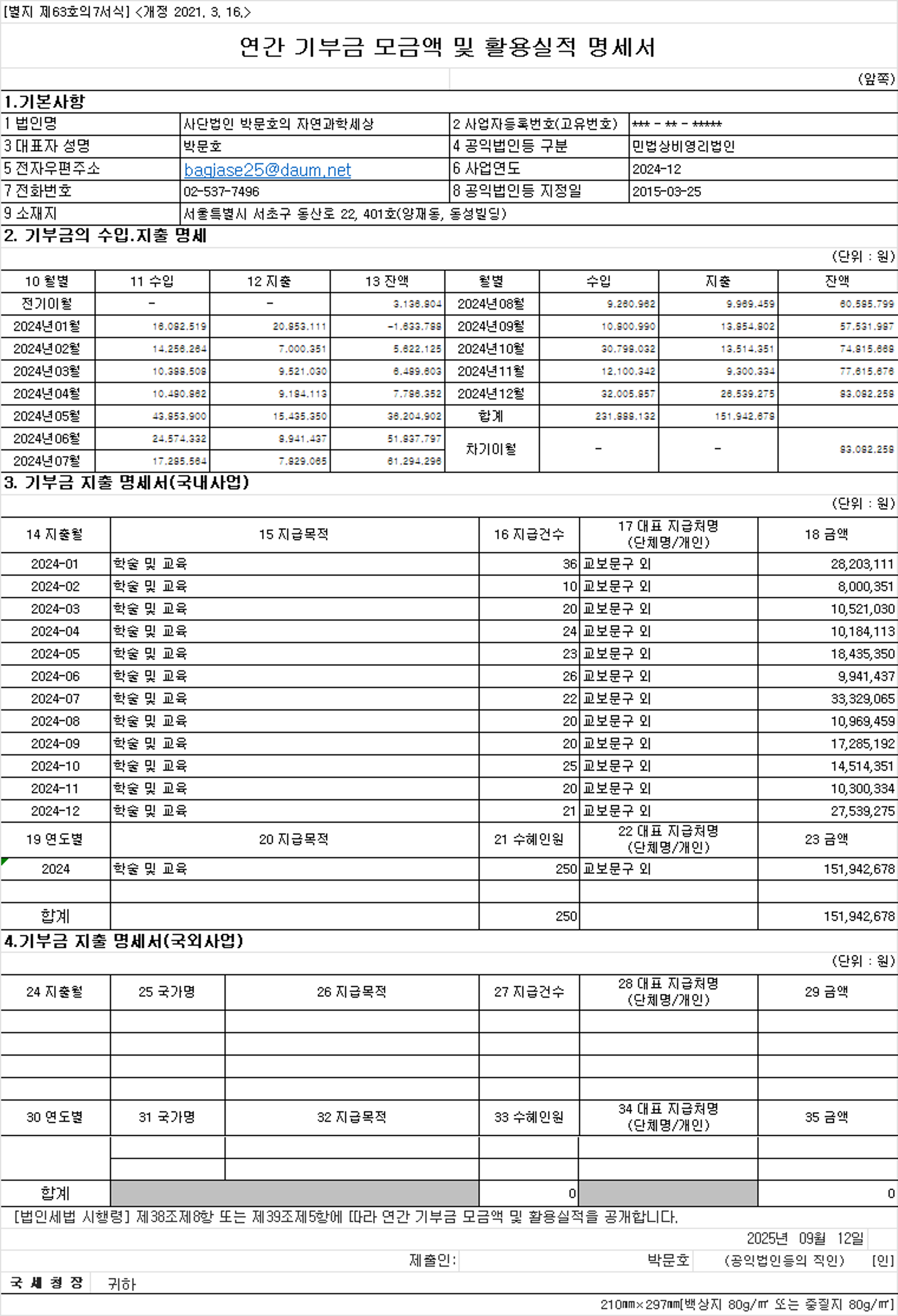 2024년 기부금 모금액 및 활용실적 게시