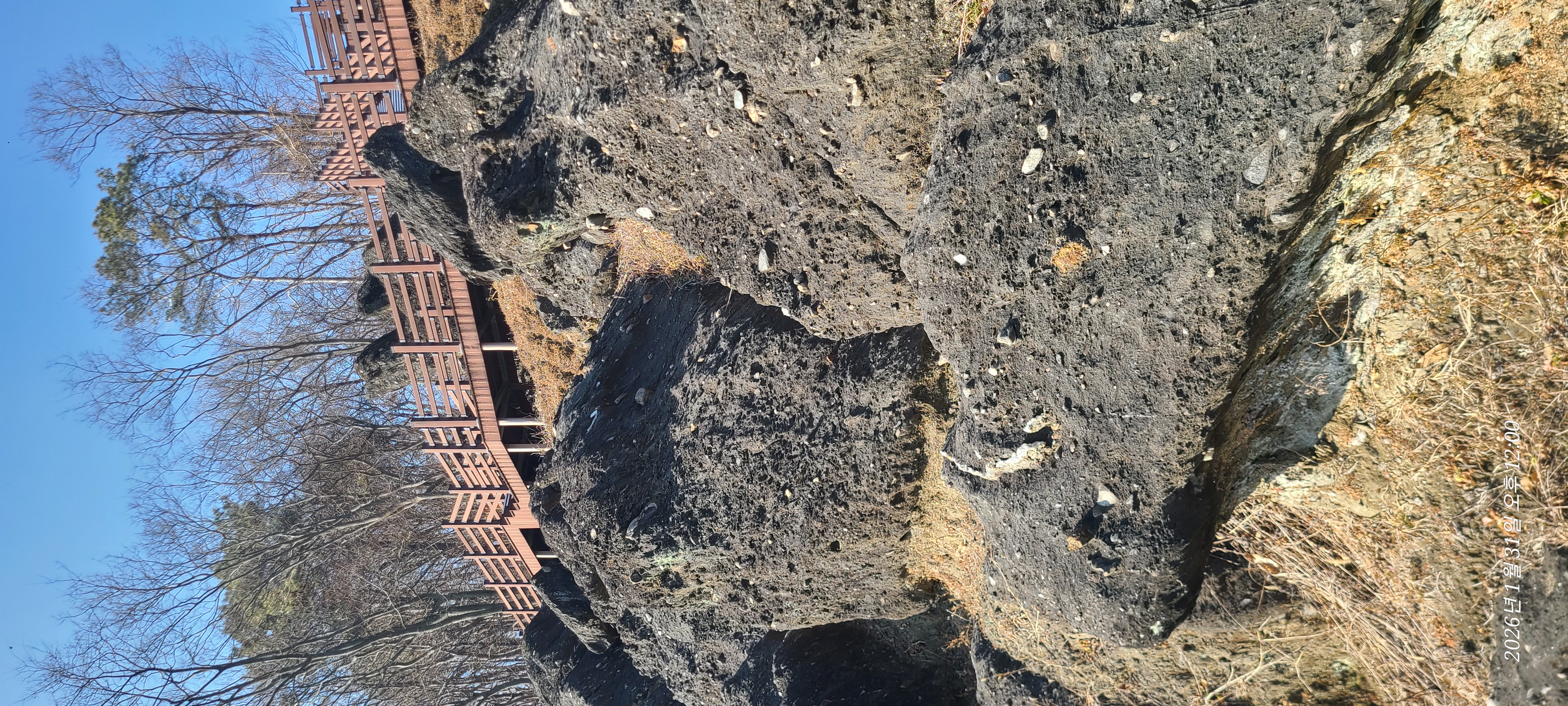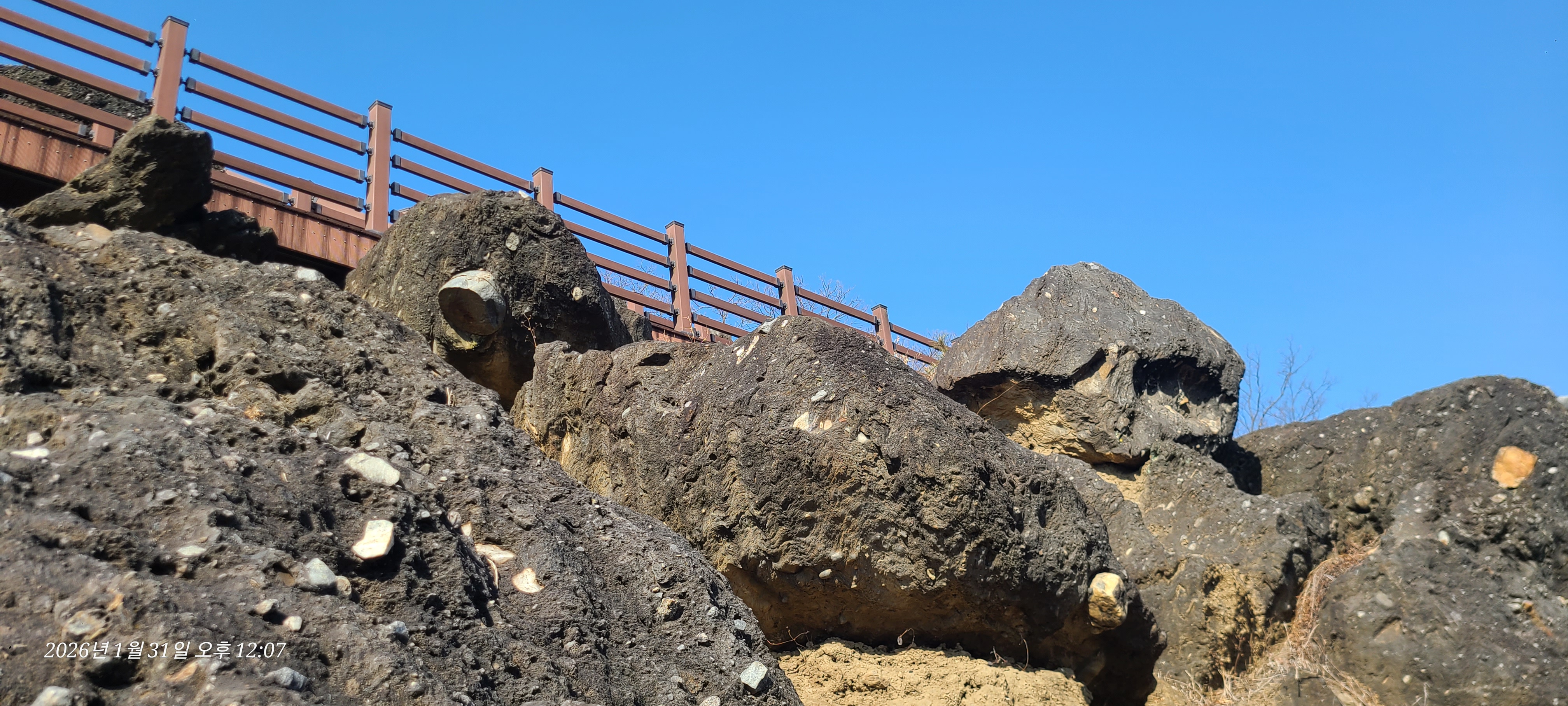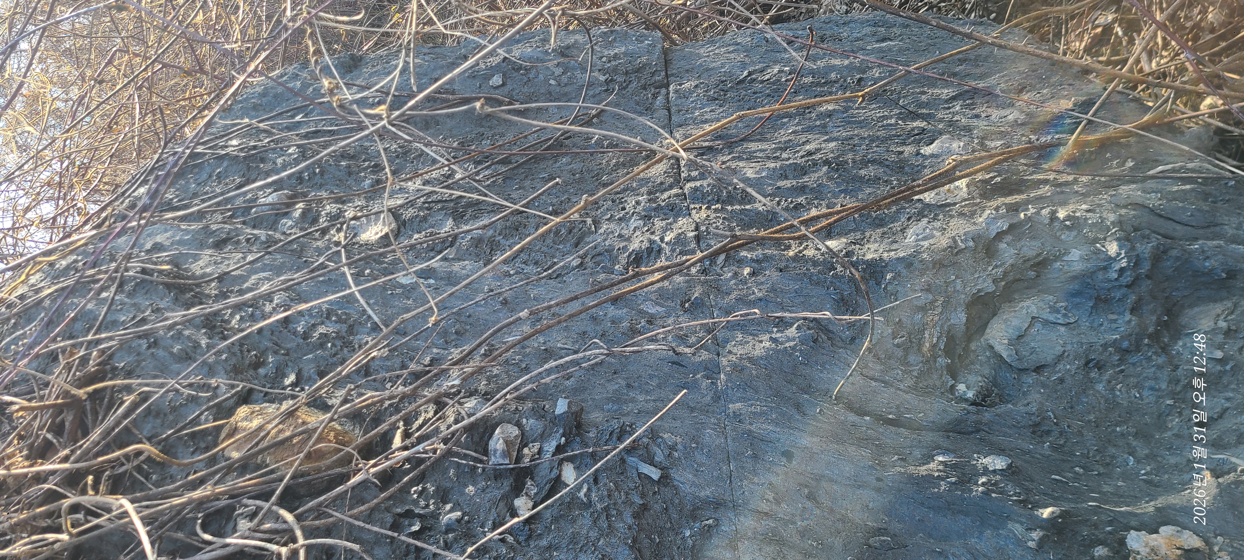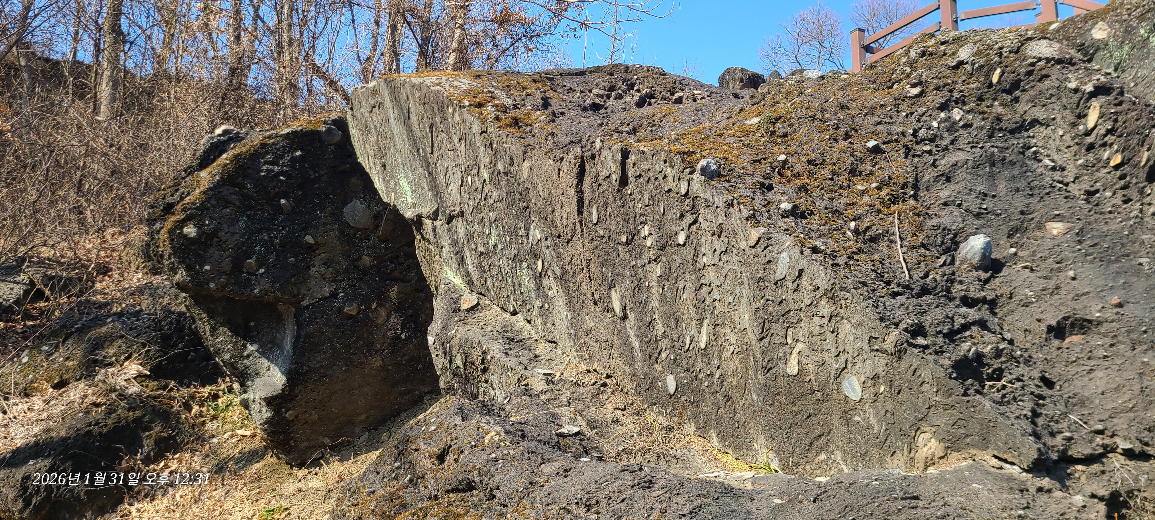현장에 가보니 저 돌들이 원래 저정도로 노출이 되있던 것은 아니고 야산에 나무들과 잡풀들 사이로 머리를 내밀고 있던것을 최덕근교수의 논문 영향 이후인지 그 자연가치를 알아보고 정비작업에 들어간 것은 아닌가 싶다.