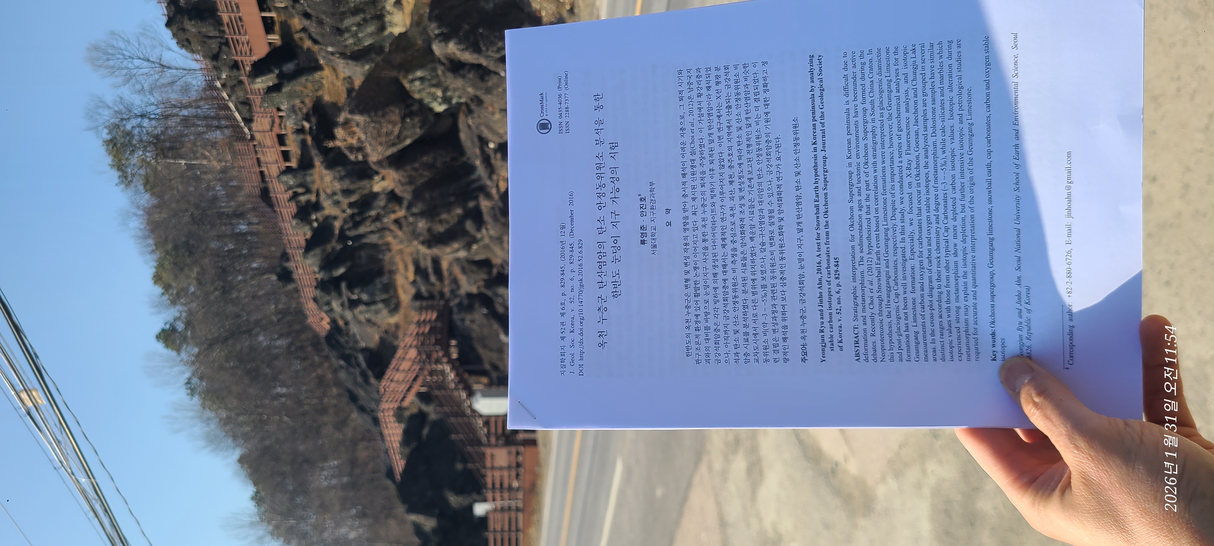 다음날 바로 답사를 가보기로하고 출력되는 동안 전문을 읽어보니 아뿔사 학부생의 논문이고 돌팡개에 관한 논문이 아니라 옥천누층군 전체에 관한 탄소동위원소 분석을 통한 눈덩이지구 사건의 증명을 시도하는 수준의 논문이다.