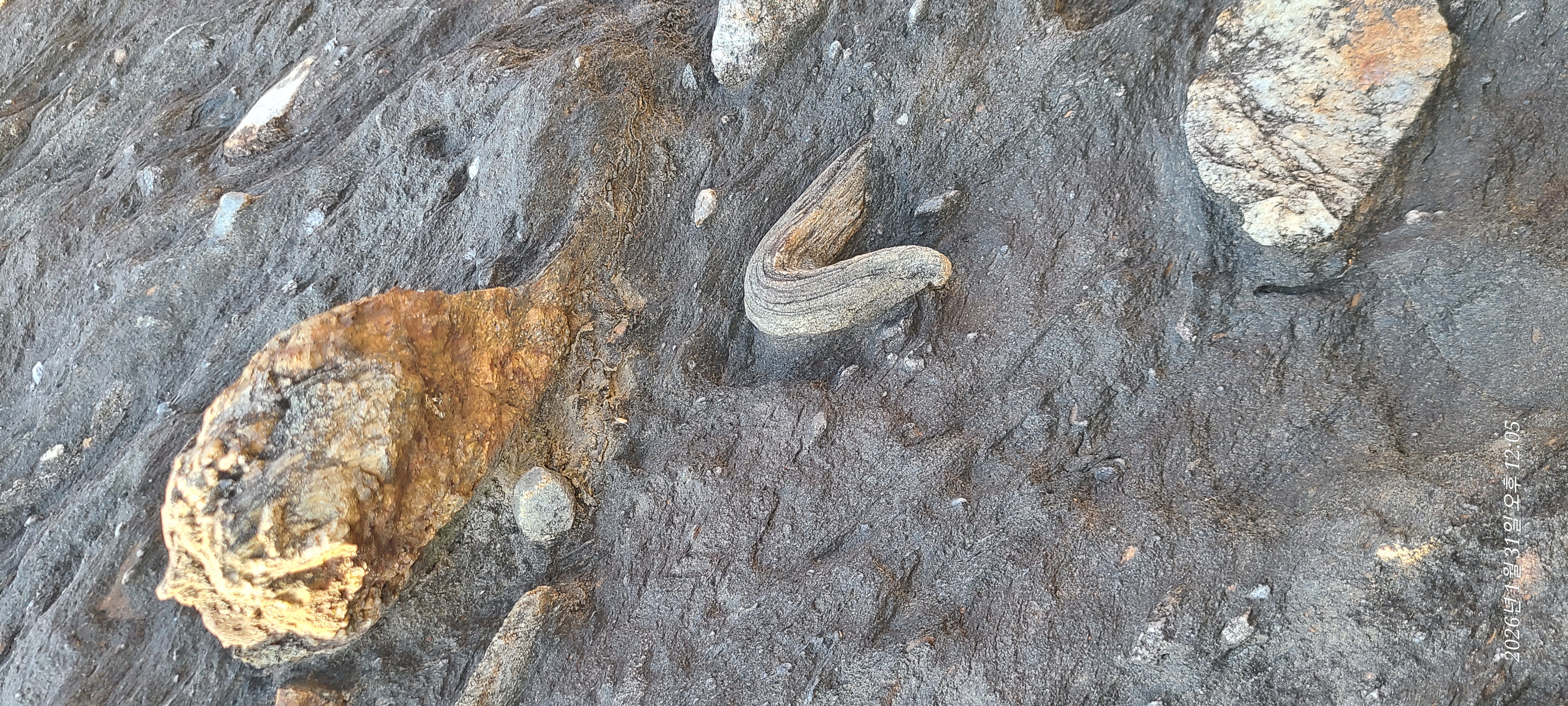 여러종류의 돌이 일정하지 않은 분급으로 뒤섞여 있고 엄청나게 단단한 차돌을 엿가락처럼 구부려 놓아 살짝 비현실적인 느낌이 든다. 엄청난 힘과 압력이 작용한건 분명하니 굴식(Plucking) 과 마식(Abrasion)이 일어난 빙하의 하부층에서 일어난 것은 분명한듯하다.