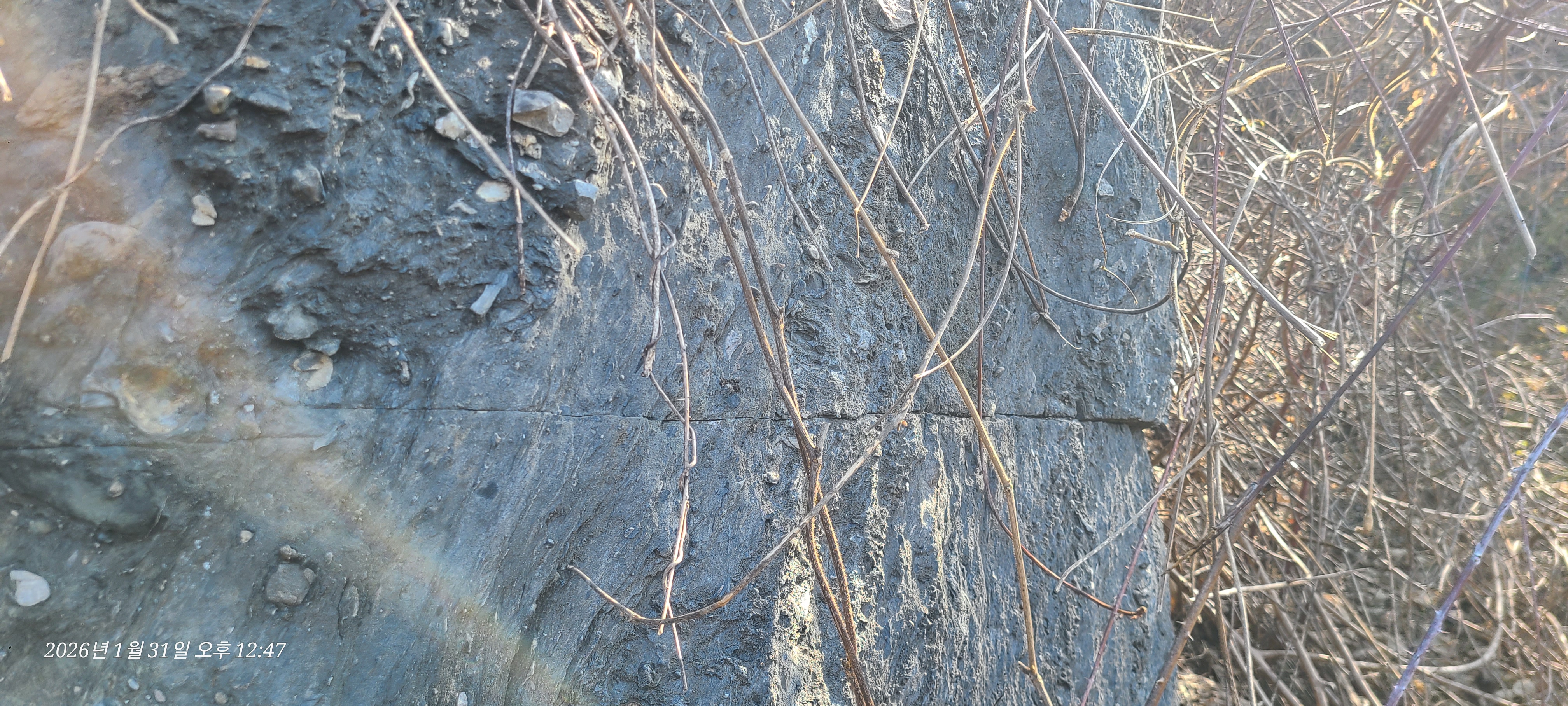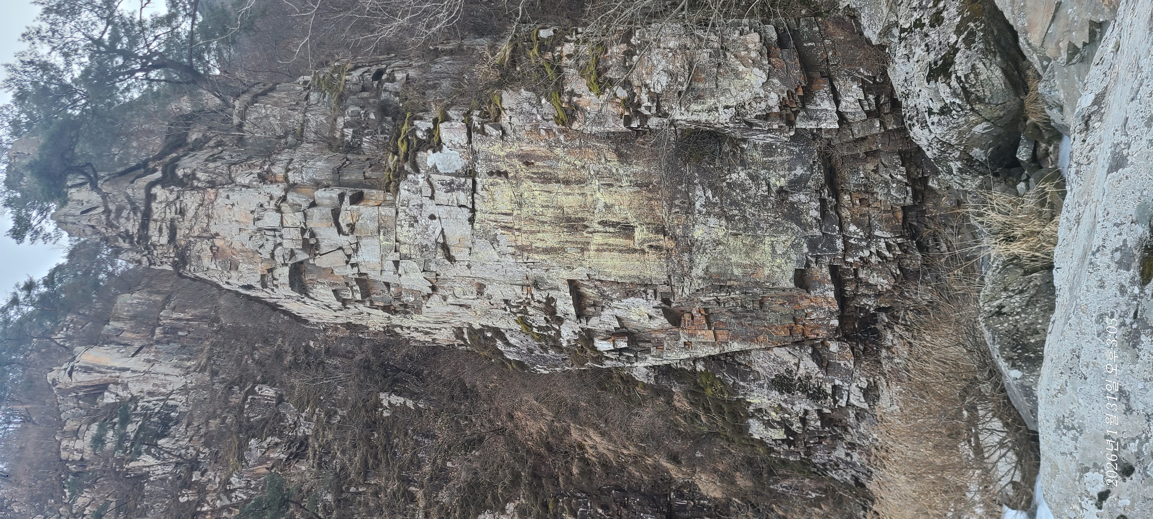 이쪽 사면에서 놀랍게도 그 반듯한 사면이 만들어지는 과정의 암석이 보인다. 중간에 선을 경계로 엄청난 압력이 작용해 반듯하게 자르는